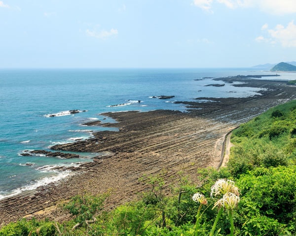 日南海岸は宮崎県内でも有数のドライブスポットです。千畳敷(通称:鬼の洗濯板)は約700万年前に海中で出来た固い砂岩と軟らかい泥岩が積み重なった地層が隆起し、長い年月をかけて波に軟らかい地層が流されて出来上がった凹凸のある岩が重なったように見える地形です。潮が引いたときに見られる広大な千畳敷は壮大な風景です。